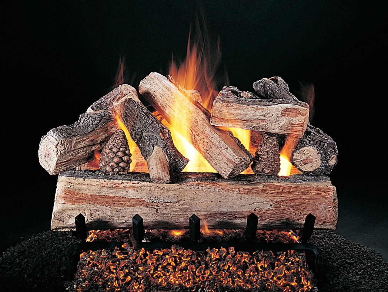 Reversible Bark/Split Logs and pine cones. Straight one piece front log. Larger scale is good for masonry and larger factory-built fireplaces.